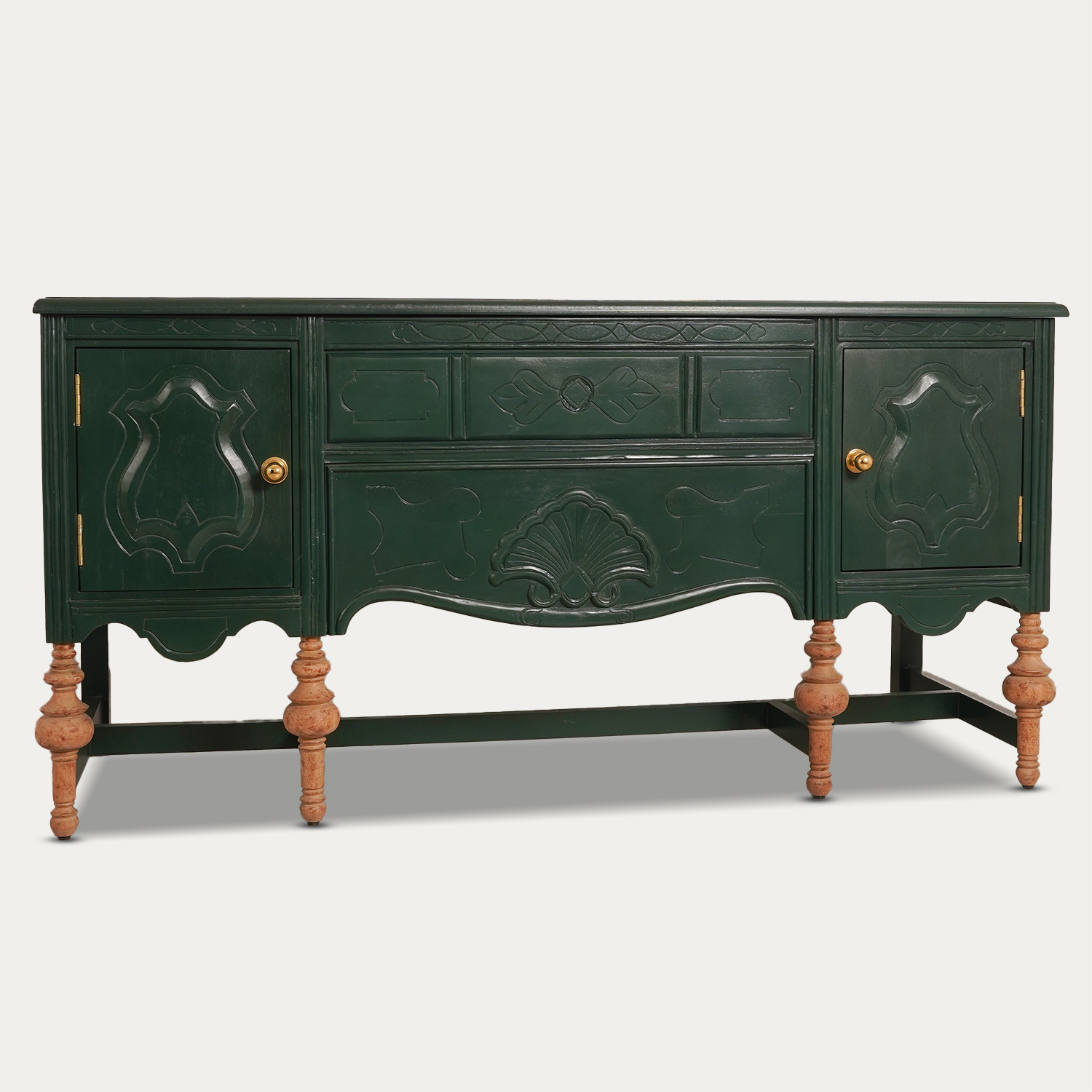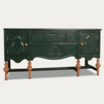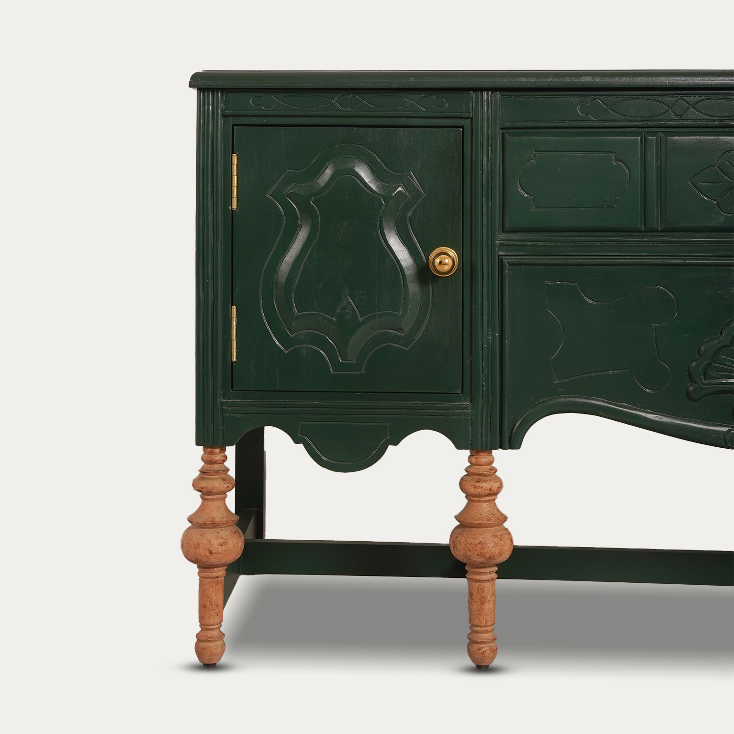 Belarus is a crafted sideboard unit is made from premium mango wood, featuring a rich green PU finish on the structure and antique natural brown legs. The piece includes a top opening storage and a front dummy drawer, adorned with beautiful hand-carved detailing that showcases exceptional craftsmanship. The brass hardware adds a sophisticated contrast to the rich green finish, making it both functional and strikingly stylish. With its large size and detailed design, this sideboard is perfect for enhancing any room. Complete the look by adding your favorite portraits and vases on top for a polished touch.