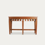 This media unit, crafted from mango wood with a stylish grey-washed finish, offers a striking blend of modern and elegant design. Featuring symmetrical triangular patterns around beautiful golden metal and pink agate handles on the cabinet doors, it exudes sophistication. The center section includes two open shelves, perfect for display or storage, while the ample space on either side provides further storage options. With its great design and statement appeal, this media unit is sure to be the focal point in your TV or drawing room, combining functionality with a touch of luxury.
