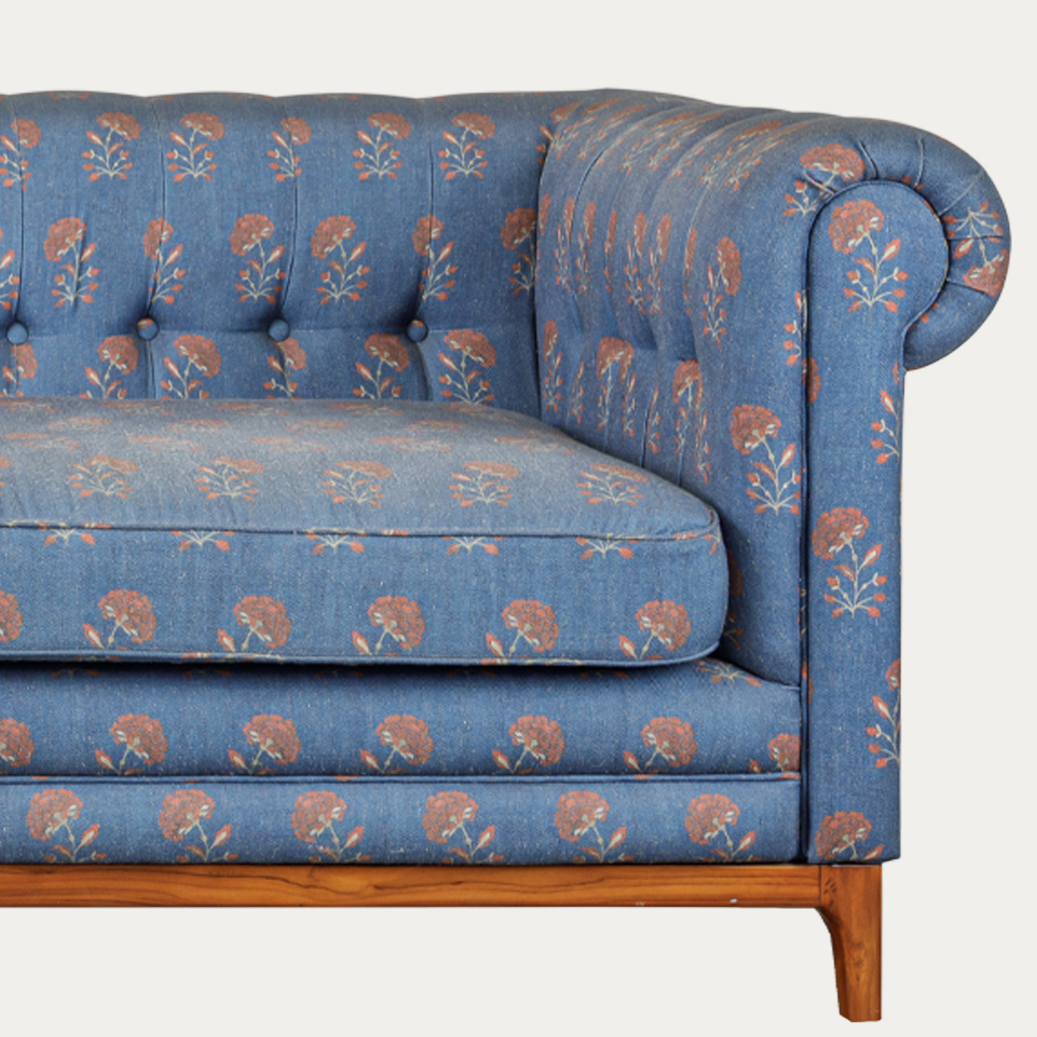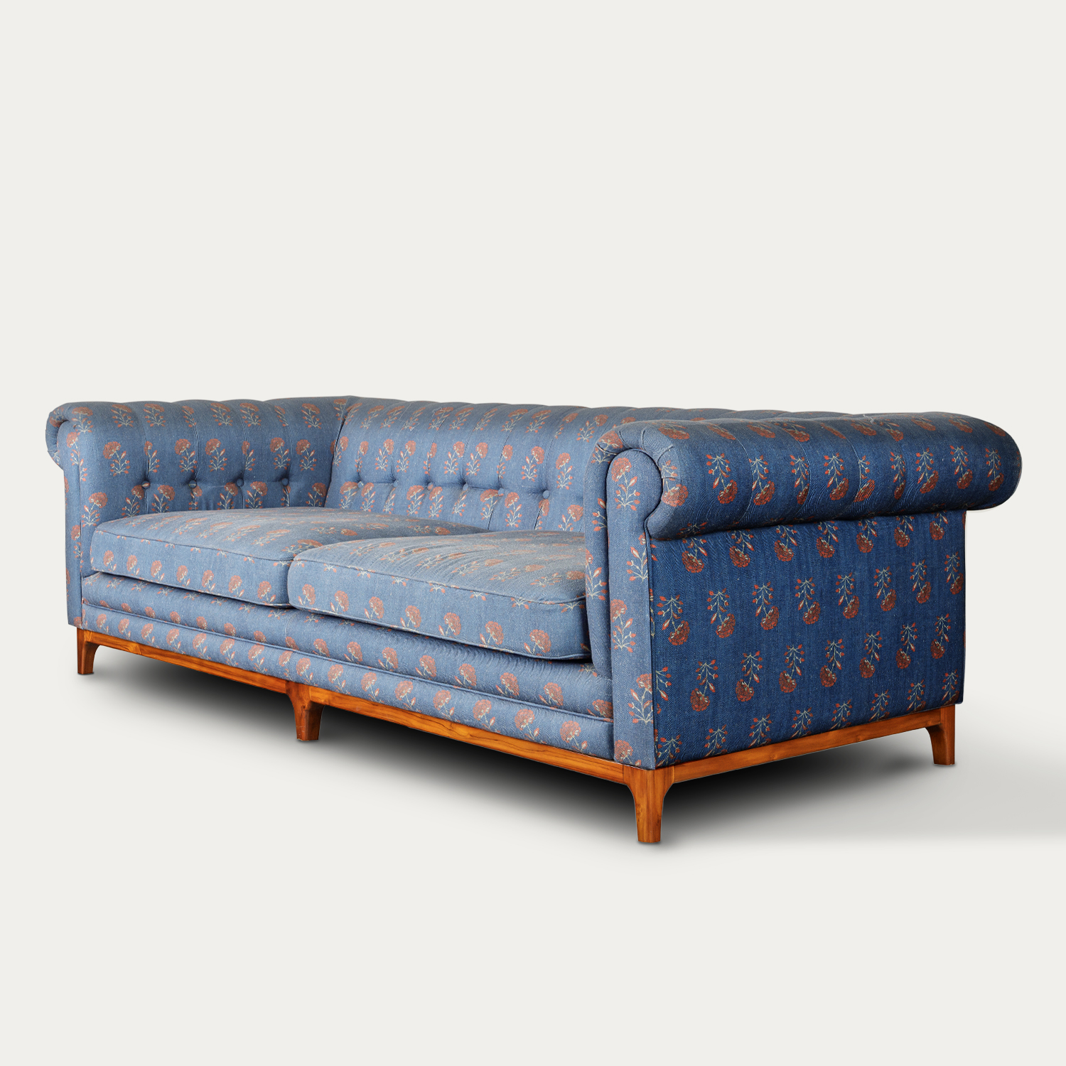 A tale of classic design and print. This elegant Chesterfield sofa combines classic design with a unique, floral-printed fabric that infuses an Indian touch, offering a vibrant and exotic charm. Made from high-quality teak wood, stained in a rich brown, the sofa features the traditional tufted button design that epitomizes timeless luxury. Drawing inspiration from the opulent tradition of 19th-century British libraries and private clubs, this piece seamlessly blends heritage and modern comfort. The expertly crafted proportions ensure unparalleled relaxation, making it the perfect centerpiece for formal living rooms or lounges. Super comfy and beautifully stylish, this sofa will be a cherished addition to your home for years to come.