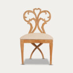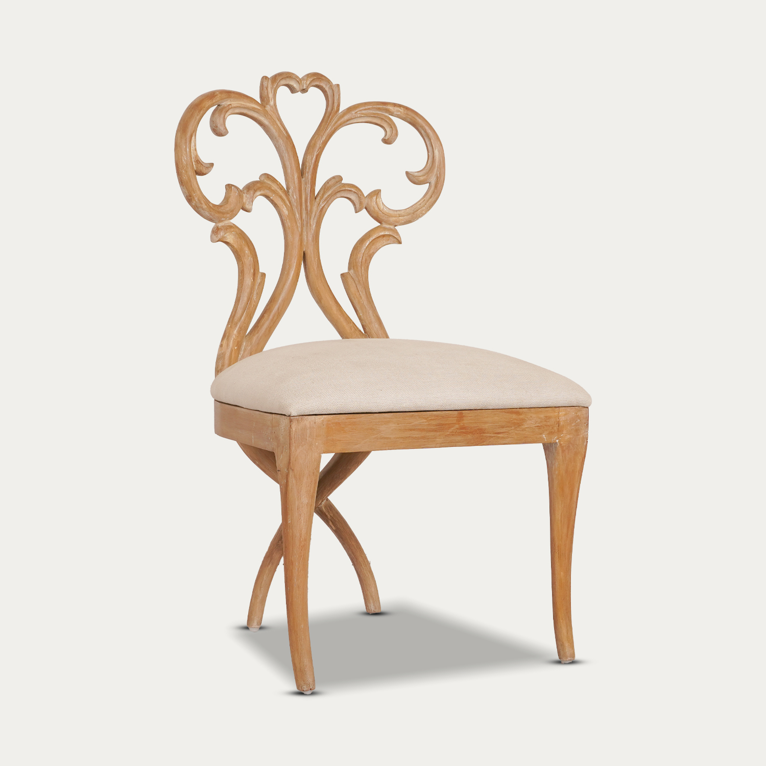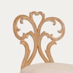 Upholstered for plush comfort, the Keyseri Chair offers an inviting and unforgettable sitting experience. Its primitive design style features a backrest crafted with graceful curves, blending upholstery and wood in perfect harmony. Finished in an antique natural tone with intricate carvings, this chair exudes timeless elegance. Ideal for pairing next to a window, in your home library, or as a centerpiece in your bedroom sanctuary, it also serves as a stylish addition to your dining table, bringing both comfort and character to any space.