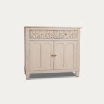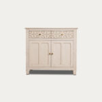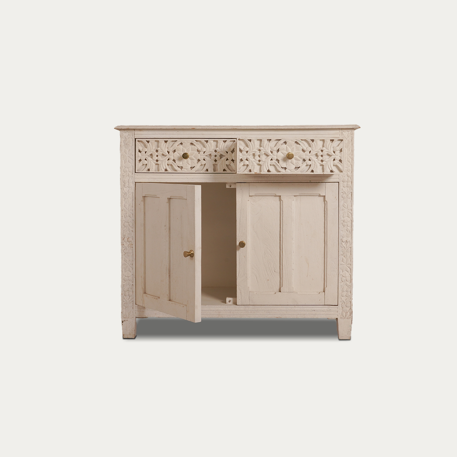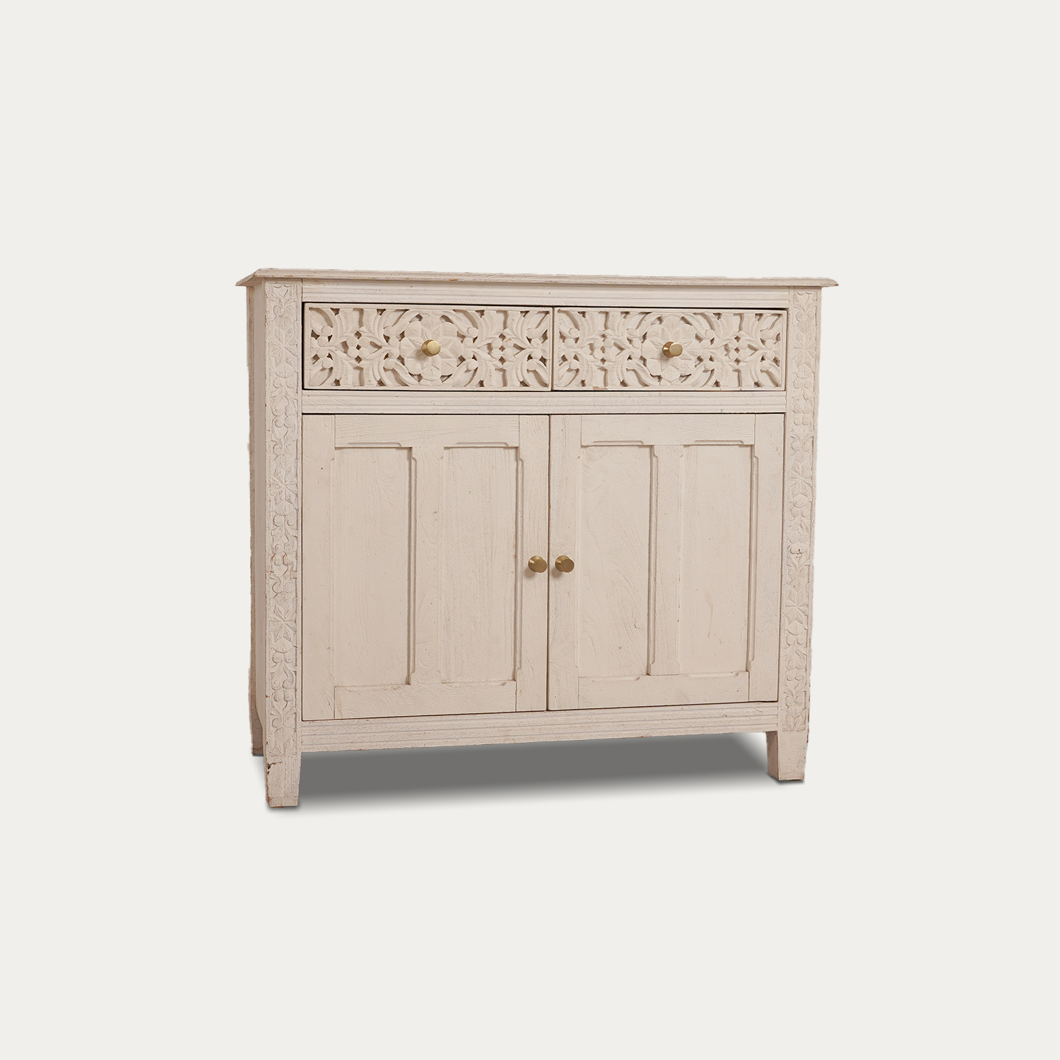 Our Kosovo cabinet, crafted from solid wood, features a beautiful white finish with intricate carving details, giving it a rustic yet elegant charm. Compact yet spacious, it offers two drawers and two cabinets for convenient storage. The versatile top surface can also be used for additional display or as a functional minibar. Ideal for your living room or guest room, its clean white color enhances its simplicity and timeless appeal, making it a perfect addition to any home.