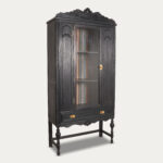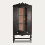 The Strasbourg Cabinet is a vintage-inspired, tall display cabinet that offers both functional storage and an elegant touch to any space. Designed with multiple compartments and shelves, it provides ample space for crockery, decor items, and books. The cabinet features an overall black finish with intricate hand-carved designs, along with glass doors and brass hardware, adding a sophisticated touch. The beautiful back fabric enhances the cabinet’s design, elevating its overall elegance. Perfect for dining rooms, this timeless piece adds a level of luxury and refinement to any home.