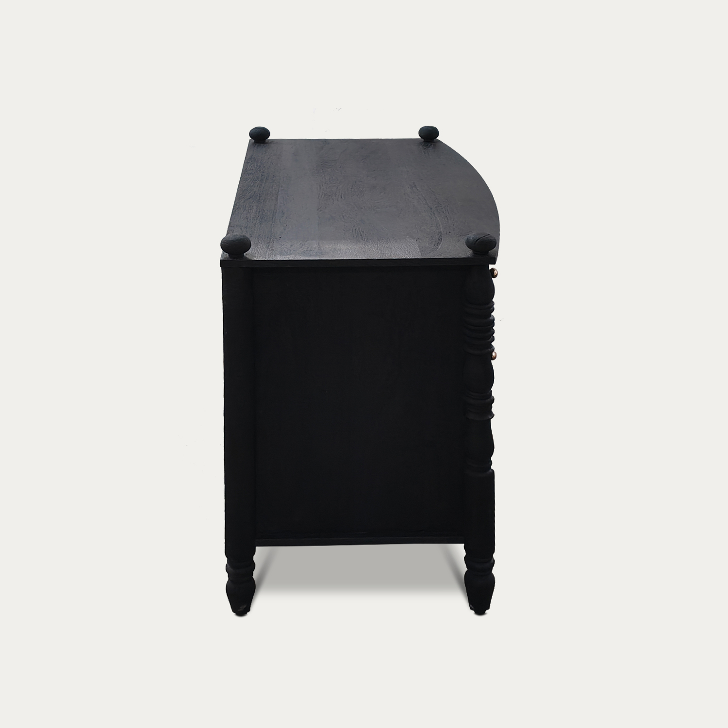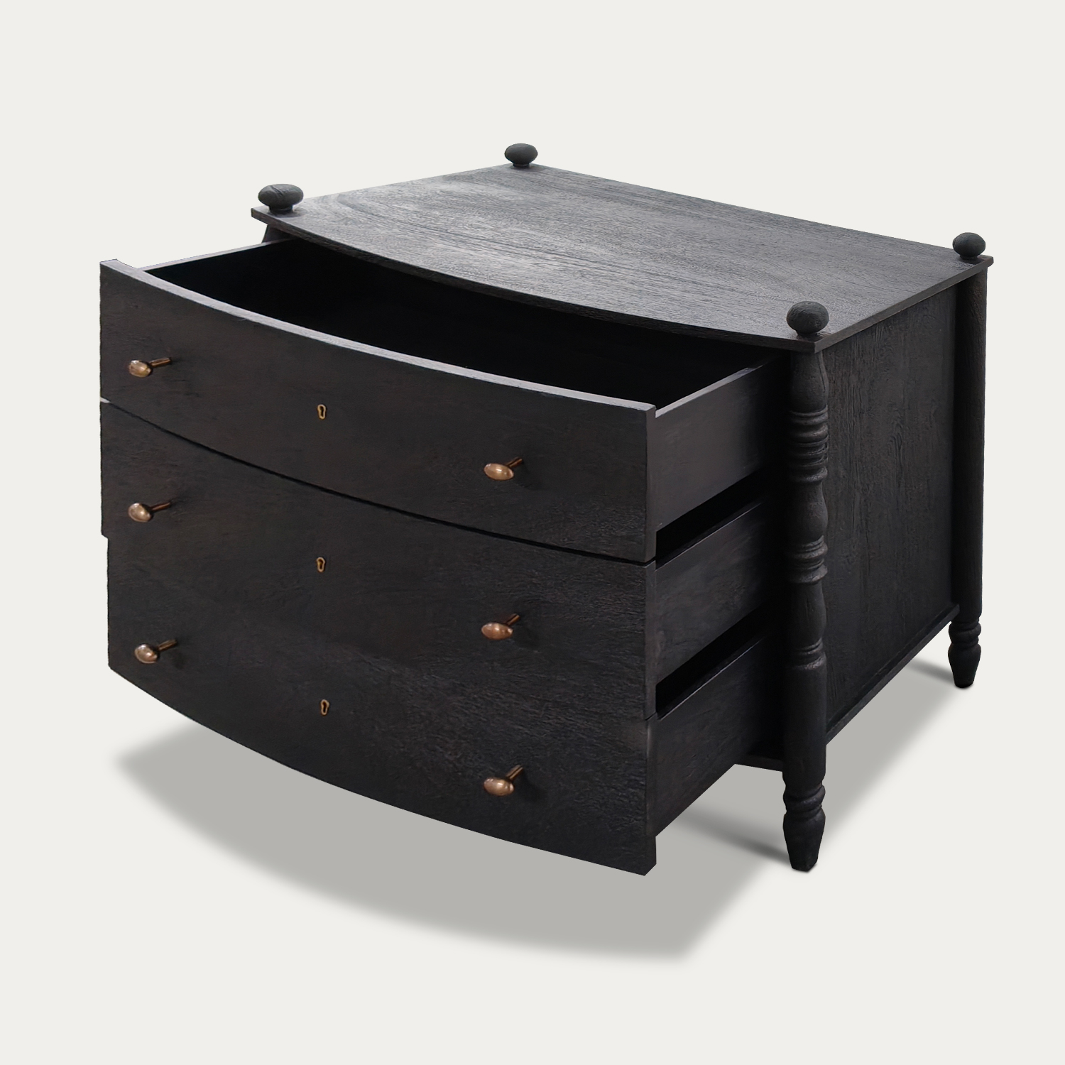 The stunning Tuscany 3 drawer dresser unit , crafted from acacia wood and finished in sandblast black, adds a gorgeous rustic charm to your bedroom. Featuring elegant golden metal knobs, it serves as both a functional storage solution and a stylish piece of furniture. With ample storage space and a spacious tabletop, this unit helps keep your bedroom organized while elevating its overall style with its unique and sophisticated design.